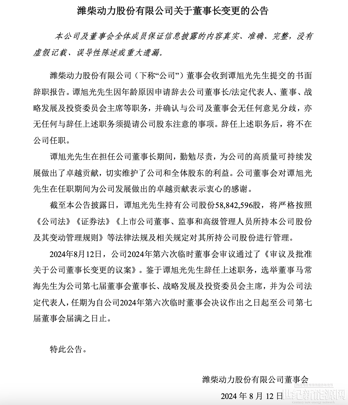 近日濰柴動力發(fā)布公告稱,譚旭光因年齡原因申請辭去公司董事長/法定代表人、董事、戰(zhàn)略發(fā)展及投資委員會主席等職務,辭任上述職務后,將不在公司任職。